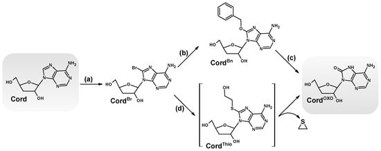 As mentioned in the introduction, Cord is an analogue of canonical dAdo and Ado. Thus, it seems reasonable to expect that this purine nucleoside analogue will be subject to the same oxidation and free radical processes, leading to the formation of 7,8-dihydro-8-oxo-3′-deoxyadenosine (CordOXO) [23]. CordOXO was synthesised for the first time according to the typical synthetic methodology used for 8-oxo-purine synthesis [24]. As shown in Figure 2, the starting substrate Cord was halogenated by aqueous bromide to yield 8-bromo-3′-deoxyadnosine (CordBr) with a 90% yield. CordBr was subsequently converted by the reaction with 2-mercaptoethanol to the final product CordOXO with excellent efficiency (80%), according to the method described by Navacchia et al. [25]. An alternative method based on Williamson ether synthesis was investigated and performed [26]. 8-Benzyloxy-3′-deoxyadenosine, without chromatographic purification after 10% Pd/C hydrogenolysis, resulted in the final product CordOXO, yielding 40%. However, it was not used further due to its lengthy reaction time and low synthesis yield. 1H NMR spectral analysis revealed the characteristic cordycepin shift of the 2′ and 3′ protons, comparable to dAdo. Moreover, the UV spectra of CordOXO showed maximum absorbance at λ = 269.7 nm, while for Cord, it was measured at λ = 260 nm, which is typical for canonical nucleosides (Figure 3). Moreover, the UV spectral profile was found to be similar to that of 7,8-dihydro-8-oxo-2′-deoxyguanosine (dGOXO). Chromatographic analysis of CordOXO mobility on reverse-phase support using HPLC showed a longer elution time than the parent Cord and dAdo, i.e., 10.43, 10.13, and 9.53 min, respectively (Figure 3). These results indicate an increase in the lipophilicity of cordycepin after its oxidation to CordOXO derivatives.