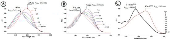Therefore, the stability of CordOXO in the presence of ADA was investigated and compared with that of Cord and dAdo. The deamination reaction was performed in 50 mM HEPES buffer (pH 7.3) at 21 °C. The reaction progress was first investigated for dAdo and Cord by absorption measurements in the range of 220–300 nm. The initial maximum was exhausted at λMax = 260 nm and disappeared, and a new maximum appeared at λMax = 249 nm, which corresponded to dIno. As shown in Figure 4A,B, during one hour, the successive maximum corresponding to substrate exhaustion was observed, with an increase in the subsequent maximum of the product. Surprisingly, in a parallel experiment, CordOXO was resistant to adenosine deaminase activity (Figure 4C), and an unexpected maximum of 259 nm was observed (Figure 4C). The above results were confirmed by sets of corresponding experiments under RP-HPLC control every 60 min with detection in the range of 190–310 nm using a Diode Array Detector (DAD).