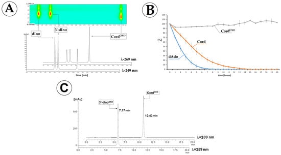 (A) RP-HPLC chromatogram profile recorded in the λ range of 190–310 nm of a Cord, dAdo, and CordOXO mixture after 20 h of deamination reaction catalysed by adenosine deaminase (0.001 U). (B) Profile of substrate disappearance during a period of 20 h; results obtained by RP-HPLC monitoring. (C) Deamination of CordOXO after 60 min, catalysed (forced) by a 105 times greater concentration of ADA (100 U) than in the case of results exhibited by A and B graphs (0.001 U).