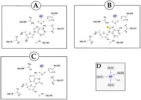 It has been previously found that the syn conformation is thermodynamically preferred to the anti-conformation of CordOXO [34]. The adenosine deaminase polar active site containing the Zn2+ ion is coordinated by His 15, His 17, His 214, Asp 296, Asp 295, and H2O molecules, which are activated by His 238. Moreover, previous studies have identified the following hydrogen bonds between the metalloprotein and the substrate as crucial for the deamination reaction (Figure 6 and Table 1: Asp 19:5′ and the 3′ OH group of Ade, Gly184:N3, Glu217:N1 and N6, and Asp296:N7.
