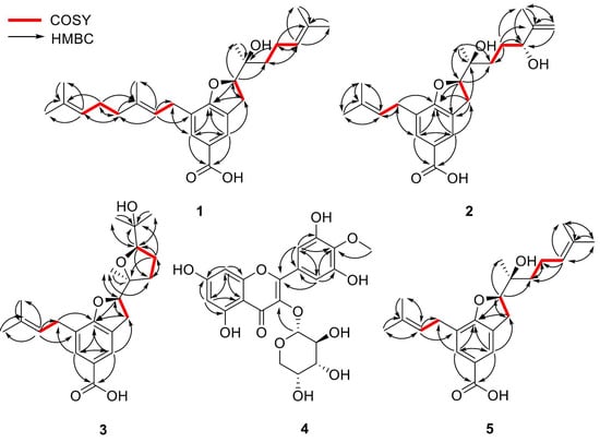 1H–1H COSY (bold lines) and HMBC (arrows) correlations of 1–5.