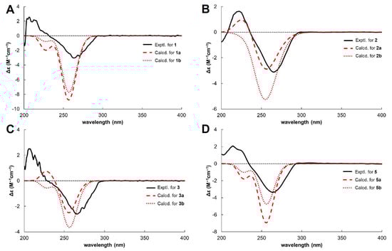 Experimental and calculated ECD spectra of 1 (A), 2 (B), 3 (C) and 5 (D).