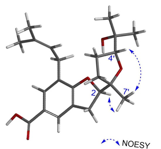 The data indicate that 1 possesses a 2,3-dihydrobenzofuran-5-carboxylic acid skeleton, which is corroborated by the heteronuclear multiple-bond correlation (HMBC) (Figure 2) between H-2 and C-7a. Further analysis of the remaining signals of 1 revealed the presence of two distinct side chains: units A and B. The 1D NMR (1H and 13C NMR spectra) signals of unit A—δH 1.57 (3H, s, H-5‴), 1.65 (3H, s, H-4‴), 1.70 (3H, s, H-5”), 2.01 (2H, m, H-4”), 2.08 (2H, m, H-1‴), 3.28 (2H, m, H-1”), 5.09 (1H, t, J = 7.0 Hz, H-2‴), and 5.28 (1H, t, J = 7.3 Hz, H-2”)/δC 16.43 (C-5″), 17.89 (C-5‴), 25.87 (C-4‴), 26.87 (C-1‴), 28.38 (C-1″), 39.94 (C-4″), 121.37 (C-2″), 124.34 (C-2‴), 131.75 (C-3‴), and 137.07 (C-3″)—are consistent with a geranyl group. Unit B was identified as a 1′-hydroxy-1′,5′-dimethylhex-4′-enyl moiety, inferred from the following NMR data: δH 1.28 (3H, s, H-7′), 1.51 (2H, m, H-2′), 1.61 (3H, s, H-8′), 1.67 (3H, s, H-6′), 2.11 (2H, m, H-3′), and 5.10 (1H, t, J = 7.0 Hz, H-4′)/δC 17.91 (C-8′), 22.18 (C-3′), 22.89 (C-7′), 25.90 (C-6′), 37.32 (C-2′), 73.96 (C-1′), 124.22 (C-4′), and 132.46 (C-5′). These assignments are further substantiated by 2D NMR data, including 1H-1H correlated spectroscopy (COSY), correlations [unit A—H-1″/H-2″, H-4″/H-1‴, and H-1‴/H-2‴; unit B—H-2′/H-3′ and H-3′/H-4′] and HMBCs [unit A—H-2″/C-1″, C-4″, C-5″, H-4″/C-3″, C-1‴, C-2‴, H-5″/C-3″, H-1‴/C-3‴, H-2‴/C-4‴, C-5‴, H-4‴, H-5‴/C-3‴; unit B—H-3′/C-1′, C-4′, C-5′, H-4′/C-2′, C-6′, C-8′, H-6′, H-8′/C-5′, H-7′/C-1′] (Figure 2).