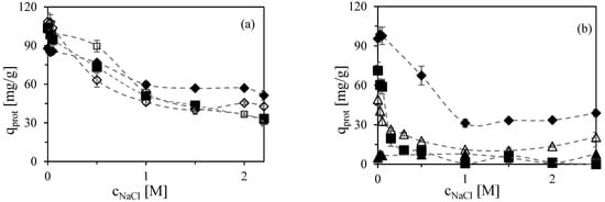 The data presented in Figure 1 confirm that at pH 5 and 6, hydrophobic and electrostatic interactions act cooperatively, resulting in relatively high protein-binding capacities and increased salt tolerance [25]. Although the amount of adsorbed proteins decreased with increasing NaCl concentration due to the impact of electrostatic interactions, the persistence of significant protein adsorption even at high ionic strength (Figure 1a) clearly indicates the contribution of hydrophobic interactions.