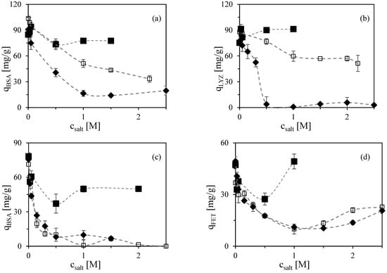 Effect of salt concentration on the specific equilibrium of adsorbed amount of protein on the multimodal adsorbent Capto MMC: (a) BSA at pH 5, (b) LYZ at pH 5, (c) BSA at pH 6, and (d) FET at pH 6. Salt types are distinguished by symbols: ■ (NH4)2SO4, ☐ NaCl and ◆ MgCl2. Error bars represent standard deviations.