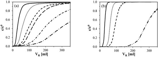 In subsequent experiments, protein interactions with the multimodal Capto MMC adsorbent were further investigated using column chromatography. Breakthrough curves for BSA and lysozyme at various initial protein concentrations are presented in Figure 3. The adsorption buffer was selected based on the outcomes of the batch equilibrium experiments, with the aim of maximizing protein binding. Accordingly, a 50 mM acetate buffer at pH 5 was employed, as it yielded the highest adsorbed protein amounts under batch conditions.