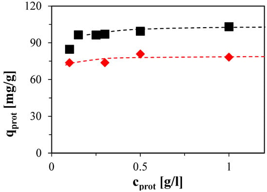 The adsorption isotherm points, shown in Figure 4, were determined by integrating the outlet protein concentration from the breakthrough curves. Under conditions favorable for protein adsorption, the resulting isotherms exhibit a nearly rectangular shape. This suggests strong binding to the adsorbent. Notably, even at an equilibrium protein concentration as low as 0.1 g/L, the amount of adsorbed protein approached the maximum binding capacity of the respective protein, indicating high affinity and efficient utilization of the binding sites.
