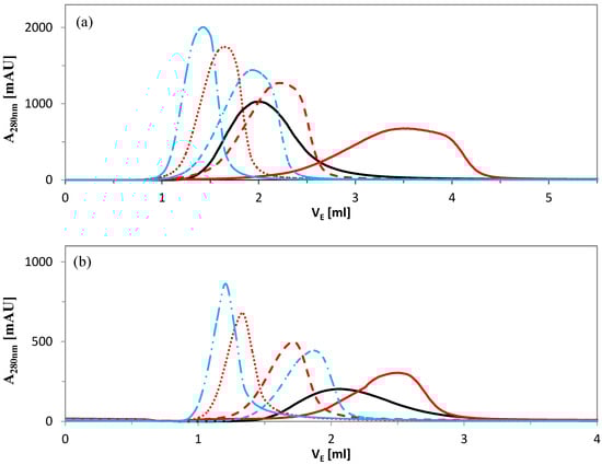 Influence of eluent on elution of (a) BSA and (b) fetuin. Buffer types are distinguished by color and pH by a line type. Acetate pH 6—solid line (—), Bis–Tris (red): pH 6—solid line (—), pH 6.5—short dashed (- - -), pH 7—dotted (····), Tris–HCl (blue): pH 8—dash-dotted (- · -), pH 9—dash-double dotted (— · · —).