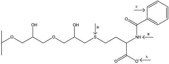 Ligand of multimodal adsorbent Capto MMC: N-benzoyl-homocysteine. The ligand can bind protein by ionic interactions (A), hydrogen bonds (B), hydrophobic interactions (C), and tiophilic bridges (D).