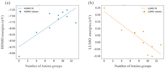 Dependence of HOMO and LUMO energies on the number of surface amino groups in functionalized adamantane. (a) The HOMO energy (in eV) as a function of the number of amino groups. The dashed line shows a linear fit. (b) The LUMO energy versus an increasing number of amino groups. Legend and units are the same as in (a).
