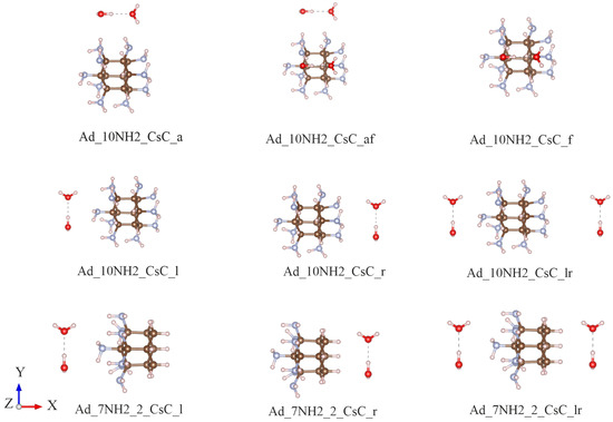 Finally, the last column of Table 2 shows that most charge transfer states corresponded to the first excited state. The association of charge transfer states with the lowest excited state is important, as higher excited states will rapidly relax to the lowest excited state. In the first example, the highly functionalized Ad_10NH2_CsC_l exhibited charge transfer at the second excited state due to the reduced electron emission properties caused by the excess amino groups. For another example, Ad_7NH2_2_CsC_r showed its charge transfer at its third excited state. Here, the amino groups were primarily on the left side of the structure, while the water dimer was on the right. Therefore, the geometric arrangement is unfavorable for charge transfer. The influence of geometry will be explored further in the following section.