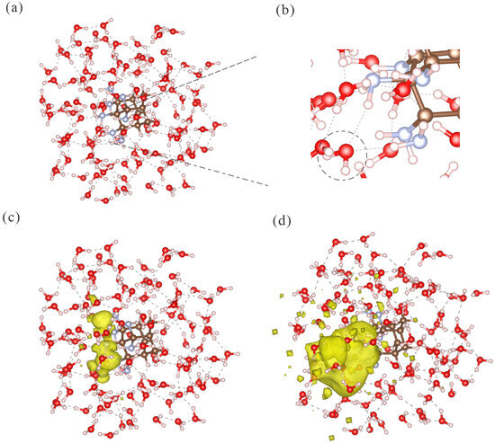 Solvation shell structures and charge transfer excited-state properties of one exemplary MD snapshot. (a) The water solvation structure around the amino group-functionalized adamantane (Ad_7NH2_2). (b) Zoomed-in view of the hydrogen bonds formed between the amino groups and water molecules. (c) Hole NTO density distribution of the excited states; the isovalue was . (d) Electron NTO density distribution; the isovalue was . The isovalues were selected based on the maximum density distribution. The excited-state energy was . The charge transfer to the water molecules () was 0.943.