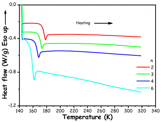 The thermal behavior of ChAc/water mixtures at different molar ratios n (n = 2–6) has been monitored by Differential Scanning Calorimetry (DSC) measurements. Heating traces are shown in Figure 1.