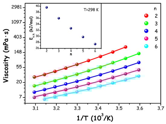 Assuming viscosity is a thermally driven process, Ea,η is a physical magnitude indicating how quickly viscosity changes with temperature. Thus, this value represents the energy activation barrier that a species must overcome when exposed to a viscous flow [16,38]. In the inset of Figure 3, this energy barrier is displayed as a function of n at a temperature of 298.15 K, revealing a clear linear decrease as water content grows.