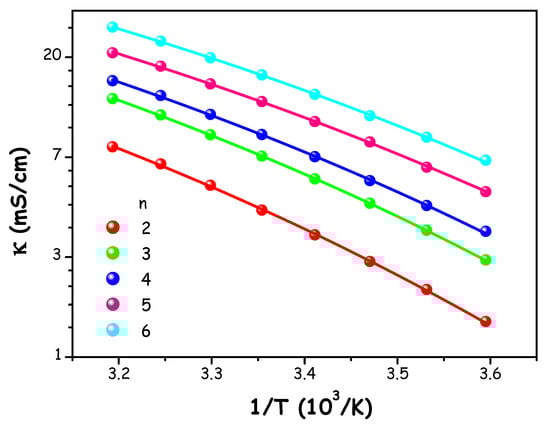 Electrical conductivity values (κ) of ChAc/water mixtures at different molar ratios n as a function of temperature. The solid lines represent the description of experimental data in terms of the Equation (6).