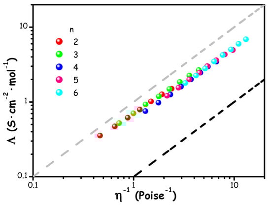This type of representation is commonly used in electrochemistry, particularly for organic electrolytes containing lithium salts [39,40,41], ionic liquids (ILs) [42,43,44,45], and more recently in the context of (deep) eutectic mixtures [46,47,48,49]. It allows the graphical evaluation of ionic dissociation in a system by comparison with an ideal reference line, typically derived from dilute aqueous KCl solutions, where ionic interactions are assumed to be negligible. The grey line in Figure 5 represents the “1 M KCl reference”, which corresponds to fully dissociated ions (α = 1), while the black line, parallel to the first but displaced downward by one order of magnitude, suggests that 90% of the ions are paired. Mixtures located between these two lines are considered to have “good ionicity”, highlighting the large population of unpaired ionic species in the mixture [50,51].