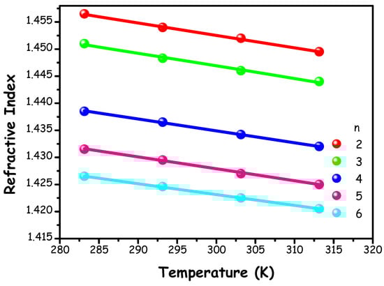 Refractive index (nD) measurements were executed on the ChAc/water mixtures (n = 2–6) every 10 K over a temperature range between 283.15 and 313.15 K. The corresponding results are shown in Figure 6 and listed in Table S11. The relationship between refractive index values and temperature was described using a linear relationship, with the corresponding fitting parameters provided in Table S12 of the ESI.