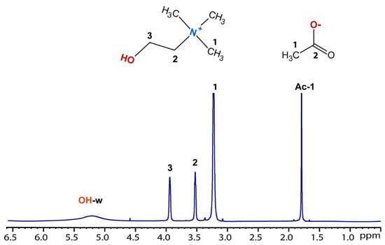 1H NMR methods have been widely used to study the local structure and dynamics of several choline-based DES systems. As an example, the proton spectrum of ChAc/water (n = 4), along with the molecular structure and peak assignments, is shown in Figure 7. The spectrum shows well-resolved lines for all protons of choline and acetate, in particular we observe the coalescence of the –OH and water peaks in a broad signal indicating an intermediate dynamic exchange regime on the chemical shift timescale, analogous to our previous findings on ChCl/water [16].