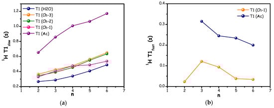 The measured T1slow of all protons in choline-acetate/water mixtures (n = 2–6) increases with increasing water content (Figure 9a). In a previous study on a series of betaine-based DESs, a minimum in the T1 of the hydroxyl proton was observed and attributed to the formation of a deep eutectic characterized by a strong hydrogen-bonding network, which restricts molecular rotational motion [55]. In the present study, since no measurements were performed for n < 2, it is not possible to identify a clear minimum. However, it is evident that the lowest 1H T1slow value is observed at n = 2, particularly for acetate protons (Ac). This suggests a reduced mobility of acetate at this composition, which likely arises from strong hydrogen-bonding interactions involving the acetate anion (Scheme 1).