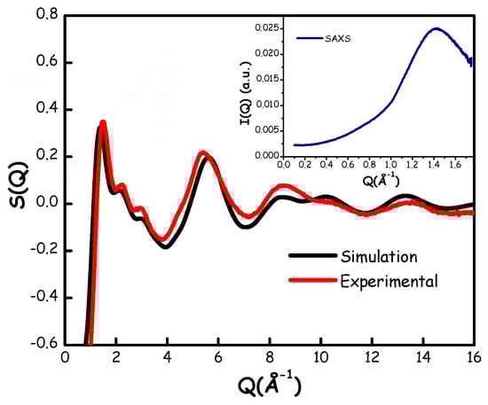 Experimental (black line, room temperature) and computed (red line, 350 K) X-ray weighted normalized structure factors for the ChAc/water mixture (n = 2). In the inset, the experimental SAXS pattern for the same mixture at room temperature.