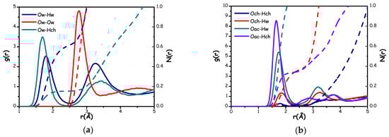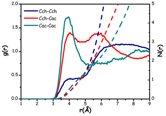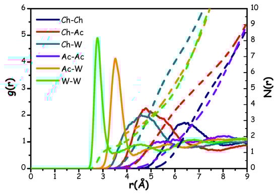 Figure 11 illustrates a situation where the correlations between the centers of mass are distributed across three distinct regions, akin to the pattern observed in a previous ChCl-based wb-DES, named Aquoline (ChCl:water 1:3.3) [17]. This effect is likely due to the difference in size between the different components: (i) at distances r < 3 Å, a sharp and intense peak centered at ca. 2.8 Å reflects the strong correlation between neighbor water molecules (W–W correlation); (ii) correlations involving W and either Ac or Ch, as well as the Ch–Ac and Ac–Ac ones, fall in the intermediate range between 3.0 Å and 6.0 Å; finally, (iii) Ch–Ch correlations are characterized by a broad, weak peak above 6 Å (at ca. 6.4 Å).