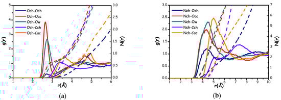 To obtain a clearer understanding of the overall structural organization, particularly around the choline cation, we further examined the RDFs associated with the correlations involving the Och or Nch atoms with selected atomic species from choline, acetate, or water (Figure 12).
