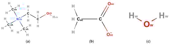 Schematic representation of choline (Ch) (a), acetate (Ac) (b), and water (c).