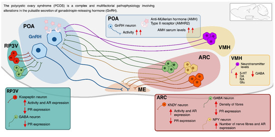 An important issue for a deeper understanding of PCOS is the identification of the etiological factors that trigger it. It is now widely accepted that it involves strong genetic and epigenetic components. The latter is probably the consequence of alterations in the intrauterine environment during foetal life. Such early perturbations may predispose women to develop the syndrome later in life and, in the case of males, to develop endocrine and/or metabolic disorders [9]. The physiopathological components to explain the origin of PCOS include (1) a metabolic disorder resulting from insulin resistance, (2) disruptions in follicular development and steroidogenesis, (3) hyperactivity of the sympathetic innervation of the ovaries, and (4) neuroendocrine dysfunction produced by an increase in the secretion of the gonadotropin-releasing hormone (GnRH) and the luteinizing hormone (LH) [10]. In the present review, we focus on the last component by analysing the participation of the hypothalamic nuclei that regulate the activity of GnRH neurons and their link to the development of PCOS.