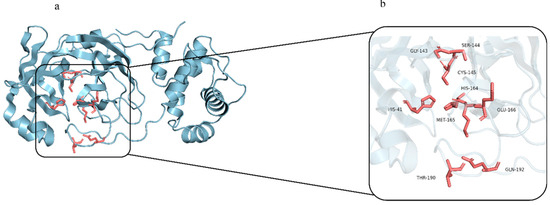 (a) Three-dimensional structure of SARS-CoV-2 main protease (MPro); (b) close-up view of the MPro active site.
