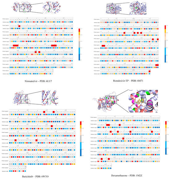 Visualization of the attention weights learned by our DL model for four drug–protein pairs: Nirmatrelvir and PDB:6LU7, Remdesivir triphosphate (Remdesivir TP) and PDB:6M71, Baricitinib with PDB:6WTO, and Dexamethasone with PDB:1M2Z. In the “Attention weight” row, colors indicate the attention assigned to individual residues (red: high weight; blue: low weight; scale shown on the right). Residues marked in red in the “Protein sequence” row correspond to experimentally validated binding sites. Additional details on high-attention residues are provided in Table S1 of the Supplementary Information.