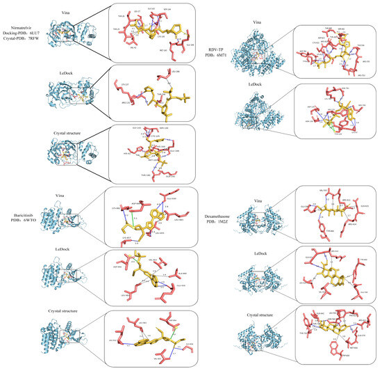 Best binding poses for four drug–protein pairs (i.e., Nirmatrelvir–MPro, Remdesivir triphosphate–RdRp, Baricitinib–JAK2, and Dexamethasone–glucocorticoid receptor) using LeDock and AutoDock Vina. For each pair, the overall binding conformation is shown on the left, while a close-up view of the binding site is shown on the right. In the close-up images, protein residues are colored red, drug molecules are yellow, hydrogen bonds are shown as blue lines, and hydrophobic interactions are shown as grey lines.