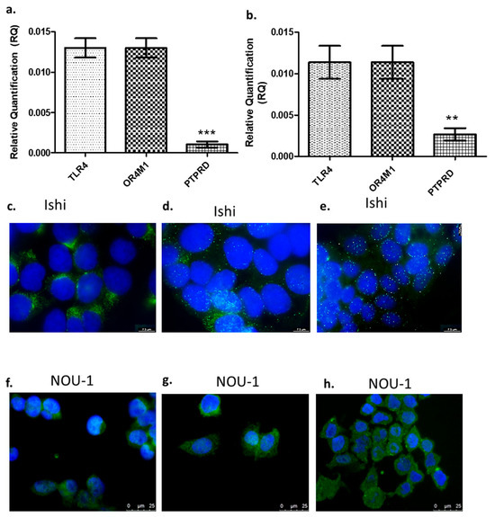 In this study, we have used two different EC cell lines, namely Ishikawa and NOU-1. RT-qPCR confirmed the expression of all asprosin’s putative receptors, i.e., TLR4, PTPRD and OR4M1 (Figure 1a,b). In both cell lines, PTPRD’s expression was significantly lower when compared to TLR4 or OR4M1. Immunofluorescence analysis was also conducted to assess the protein expression of these receptors. A strong cytoplasmic/membrane staining was evident for TLR4 for both cell lines (Figure 1c,f), whereas PTPRD had mainly a scattered cytoplasmic distribution in Ishikawa cells and more membranous in NOU-1 cells (Figure 1d,g). Finally, OR4M1 demonstrated mainly a membrane localisation in Ishikawa cells, in accordance with its role as a G protein-coupled receptor (GPCR; Figure 1e,h).