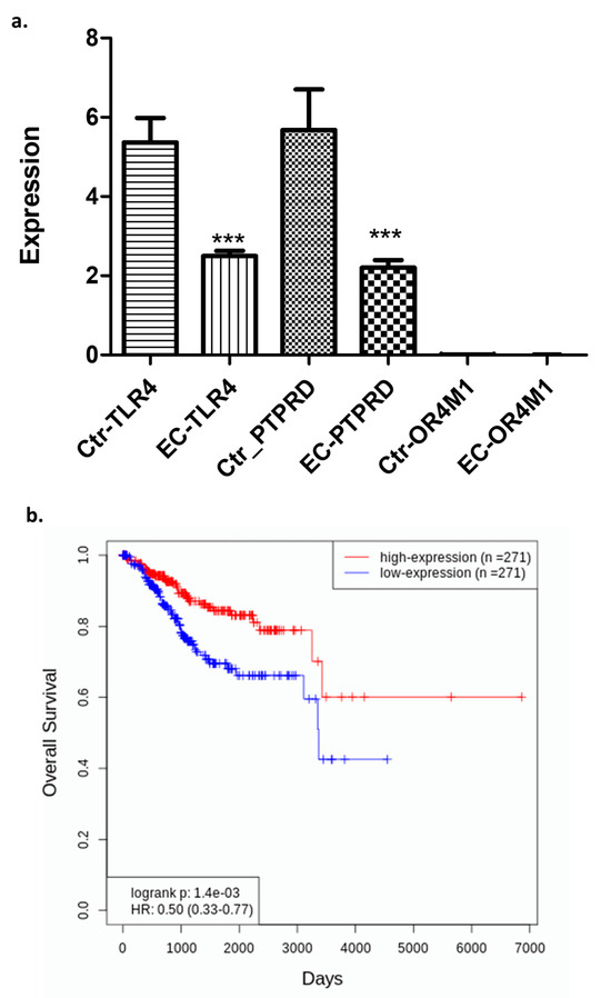 Expression of the TLR4, PTPRD, and OR4M1 asprosin receptors in EC patients (n = 557) and healthy controls (n = 35). (a) Downregulation of TLR4 and PTPRD, but not OR4M1, in EC patients compared to controls (*** p < 0.0001); (b) EC patients expressing higher levels of TLR4 (n= 271) have better overall survival compared to EC patients with lower TLR4 expression (n = 271) (p = 0.0014).