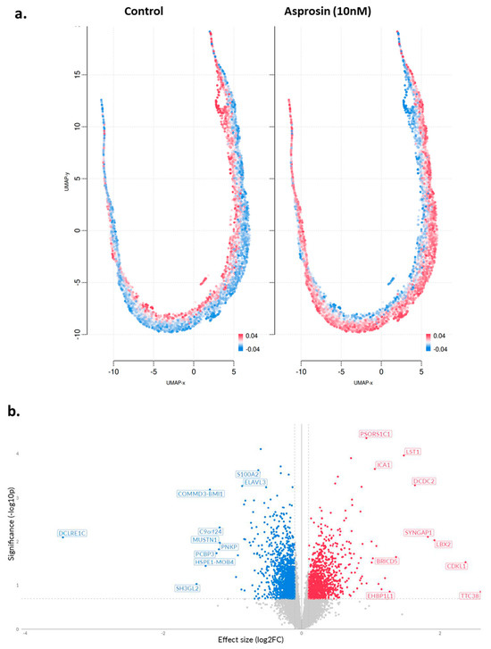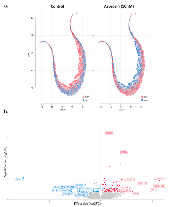 (a) UMAP projections of asprosin-treated NOU-1 cells; (b) Volcano plot of DEGs in asprosin-treated (10 nM for 4 h) cells when compared to untreated controls. Genes that are significantly upregulated are highlighted in red, whereas significantly downregulated genes are highlighted in blue. Each point represents a single gene; labelled genes (e.g., COMMD3, BMI1, DCDC2, LST1, LBX2) are among the most significantly altered. The dashed vertical lines mark a 0.1 effect size cutoff, while the dashed horizontal line denotes the p-value threshold (p < 0.05).