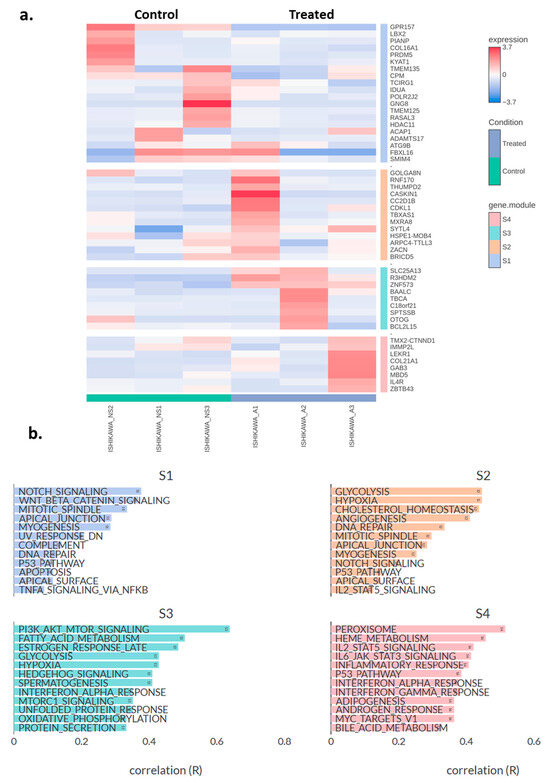 (a) Heatmap showing the top 50 differentially expressed genes in asprosin-treated Ishikawa cells (blue-labelled samples) compared to untreated controls (green-labelled samples). The colour gradient indicates standardised expression levels, ranging from low (blue, −2.5) to high (red, +3.7). Hierarchical clustering was performed on both genes and samples, with gene clusters (S1–S4) labelled on the right. A: asprosin-treated, NS: no supplement. (b) Pathway correlation analysis for the four gene clusters (S1, S2, S3, and S4). Each bar represents the correlation coefficient (R) between a given hallmark gene set and the module’s gene expression profile. Higher values of R indicate stronger associations between the module and that particular pathway. Ishikawa_A1-A3 and Inshikawa_NS1-3 refer to treated and control samples, respectively (n = 3 per group).