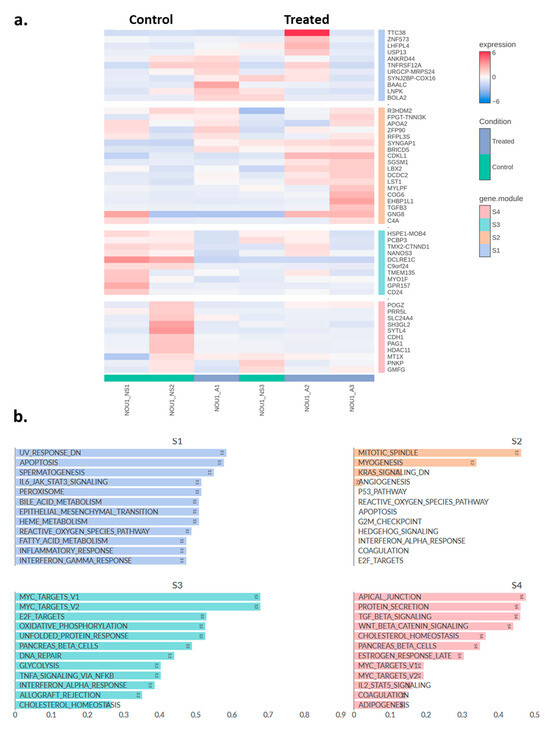 A total of 289 differentially expressed genes (DEGs) were identified, of which 186 were up-regulated and 103 down-regulated (Table A1). Figure 3a provides an overview of UMAP clustering coloured by relative log-expression of genes between the different phenotypic groups (−0.27 to 0.27 Z-score of median transcripts per million; TPM). Subsequently, a volcano plot was generated indicating log fold change (log2FC) between treated and untreated cells (Figure 3b).