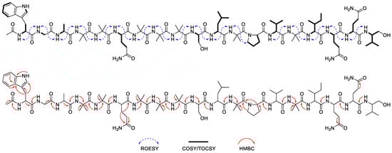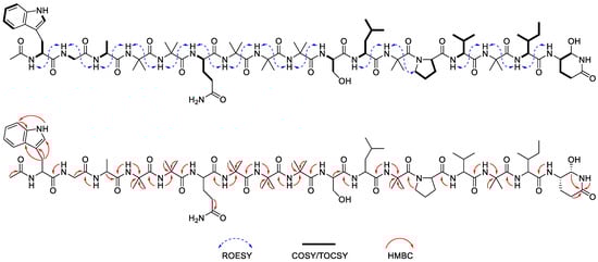 Compounds 9 and 10 were assigned the molecular formulas C82H132N20O21 and C80H131N19O21, respectively, based on the HRESIMS (Table 4). The 1H-NMR, COSY, and TOCSY spectra of 9 and 10 revealed similar cyclic-Glnol moiety at the C-terminal with 7 (Tables S13–S16). Additionally, a methoxy singlet (δH 3.29, 3H, s) was observed in 9 and 10 (Figures S89 and S100). Compound 9 exhibited indole proton signals characteristic of tryptophan (δH 11.96, 7.41, 7.83, 7.18, 7.28, 7.55; δC 124.2, 110.2, 128.1, 118.7, 119.1, 121.8, 111.9, 137.4), while compound 10 showed aromatic proton signals consistent with a phenyl ring (δH 7.30, 7.26, 7.27; δC 137.5, 129.3, 128.6, 126.9), indicating substitution of tryptophan with phenylalanine. Combined with the result of modified Marfey’s analysis (Figures S109 and S121), the structure of compounds 9 and 10 elucidated as N-acetyl-L-Trp1-Gly2-L-Ala3-Aib4-Aib5-L-Gln6-Aib7-Aib8-Aib9-L-Ser10-L-Leu11-Aib12-L-Pro13-L-Val14-Aib15-L-Ile16-L-cycGlnol17-Me (9) and N-acetyl-L-Phe1-Gly2-L-Ala3-Aib4-Aib5-L-Gln6-Aib7-Aib8-Aib9-L-Ser10-L-Leu11-Aib12-L-Pro13-L-Val14-Aib15-L-Ile16-L-cycGlnol17-Me (10). In addition, compounds 9 and 10 found to have a right-handed helical conformation based on ECD data (Figures S107 and S119). These compounds are assigned to trivial name as bukhansantaibol I (9) and bukhansantaibol J (10).