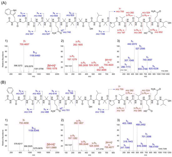 MS/MS analysis of compounds 5 (A) and 6 (B). (1) Full MS1 spectrum. (2) MS/MS spectrum of y7 ion. (3) MS/MS spectrum of b12 ion.