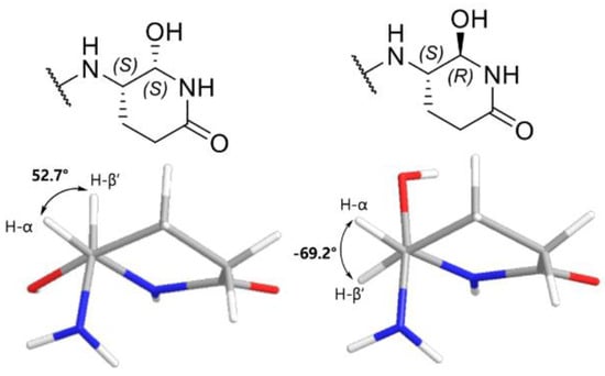 To the best of our knowledge, this is the first report of C-terminal cyclo-Glnol moiety (2-hydroxy-3-amino-6-piperidone) among peptaibol derivatives. Similar cyclization of C-terminal Asn or Gln residues has been observed during protein splicing in Pyrococcus abyssi, resulting in the formation of C-terminal aminosuccinimide or aminoglutarimide, respectively [15,16]. It could be proposed that this occurs via a nucleophilic attack by the γ-amide nitrogen on the adjacent carbonyl carbon of the peptide bond. A subsequent reduction step may then lead to the formation of the unique cyclic structure observed at the C-terminus of compound 7. The absolute configurations of the amino acid residues and the right-handed helical conformation were confirmed by modified Marfey’s analysis and ECD spectrum, respectively (Figures S83 and S85). Based on the L-configuration of Gln17, the configuration of hydroxy group was determined through analysis of the coupling constant. In the MM2-minimized models, the two possible configurations, (S,S) and (S,R) exhibited the dihedral angles of 52.7° and −69.2°, respectively, between the α-proton and β’-proton (Figure 4). Given that the measured J value of the triplet methine proton at δH 5.67 was 3.6 Hz, the smaller dihedral angle associated with (S,S) configuration is more consistent with the observed data, according to the Karplus equation [17]. Based on these results, the structure of 7 was established as N-acetyl-L-Trp1-Gly2-L-Ala3-Aib4-Aib5-L-Gln6-Aib7-Aib8-Aib9-L-Ser10-L-Leu11-Aib12-L-Pro13-L-Val14-Aib15-L-Ile16-L-cycGlnol17 and named as bukhansantaibol G (7).