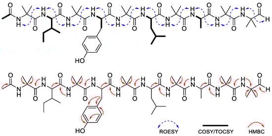 Compounds 11 and 12 (Structure shown in Table 7) were both assigned the molecular formular of C50H82N10O12 based on HRESIMS (m/z 1015.6174 [M + H]+; calcd 1015.6186). The 1H-NMR spectrum of 11 displayed characteristic signals including one aldehyde proton (δH 9.90), ten amide protons (δH 8.04–9.56), two aromatic protons (δH 7.48 and 7.17), four α-protons (δH 4.21–4.57), and eighteen methyl protons (δH 0.78–2.06) (Table 8). The TOCSY correlation enabled the identification of spin systems from amide proton to side chain protons for most amino acid residues, except Aib. Sequential connectivity of the amino acids was further elucidated through the ROESY correlations between amide protons (Figure 5). The HMBC correlation between an amide proton (δH 9.56), two singlet methyl groups (δH 1.63, 1.73) and the corresponding α-carbon (δC 56.7), together with the correlations between the same amide proton (δH 9.56), the acetyl methyl proton (δH 2.06), and the acetyl carbonyl carbons (δC 171.7) confirmed the presence of N-terminal acetylated Aib residue. Additional Aib residues were similarly assigned by the HMBC data. Furthermore, HMBC correlations from the aldehyde proton (δH 9.90) and two singlet CH3 (δH 1.59 and 1.66) to α-carbon (δC 59.2) supported the presence of aldehyde moiety of C-terminal Aib residue (Aibal, 2-amino-2-methylpropanal). Based on the etymology of peptaibol, we propose the term ‘peptaibal’ as a new class name for this sequence, which terminates with an aldehyde group instead of an alcohol at the C-terminus. Compound 12 exhibited similar 1D and 2D-NMR spectra with 11, with the primary difference being the substitution of the Ile6 in 11 with Leu6 in 12. ECD spectral analysis revealed that both compounds have a right-handed helical conformation (Figures S131 and S143). Along with the result of modified Marfey’s analysis (Figures S133 and S145), the structures of 11 and 12 were determined as N-acetyl-Aib1-L-Ile2-Aib3-L-Tyr4-Aib5-L-Leu6-Aib7-L-Ala8-Aib9-Aibal10 and N-acetyl-Aib1-L-Ile2-Aib3-L-Tyr4-Aib5-L-Ile6-Aib7-L-Ala8-Aib9-Aibal10, respectively, and named as bukhansantaibal A (11) and bukhansantaibal B (12).