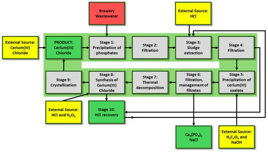 On the basis of the results of our previous research on the recovery, synthesis, properties, and application of cerium compounds [,,], which were conducted at both laboratory and semitechnical scales, an innovative solution for industrial wastewater treatment using cerium(III) chloride heptahydrate (CeCl3·7H2O) as a coagulant has been proposed. Although this concept was developed specifically for brewery wastewater, it may also be suitable for other types of industrial effluents containing phosphorus compounds. Furthermore, it is assumed that the proposed solution can be applied wherever efficient precipitation of phosphorus from contaminated water or wastewater is particularly important. The main objective of this process is the cyclic recovery of cerium from sewage sludge and the management of by-products generated during recycling.