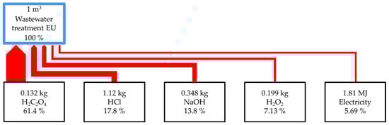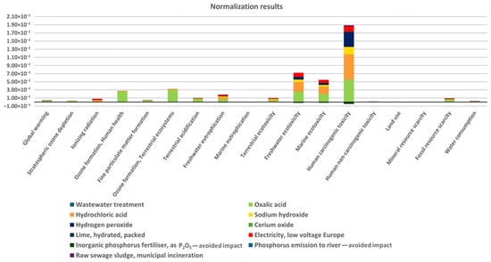 The purpose of this analysis was to assess the environmental impact associated with operations, material consumption, emissions, and waste generation resulting from the recovery of phosphates(V) from wastewater streams. The functional unit was defined as 1,825,000 m3 of wastewater treated per year, with all results normalised per 1 m3 of wastewater. The ReCiPe 2016 method was applied for impact assessment []. ReCiPe 2016 enables the assessment of potential environmental impacts in seventeen various impact categories (midpoints): climate change, ozone depletion, ionising radiation, fine particulate matter formation, and photochemical oxidant formation: terrestrial ecosystems, human health, terrestrial acidification, and freshwater eutrophication; human toxicity: cancer, noncancer, terrestrial ecotoxicity, freshwater ecotoxicity, and marine ecotoxicity; land use, water use, mineral resource scarcity and fossil resource scarcity. The hierarchist perspective was used during calculations, assuming a compromise between long-term and short-term environmental effects.