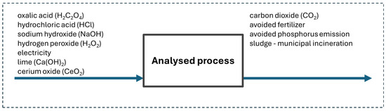 The system boundaries included the life cycle associated with the production of materials (chemicals) and electricity, as well as the generated wastewater sludge. The analysed system performs two main functions: wastewater treatment and phosphorus recovery. The multifunctionality issue was addressed by expanding the system boundaries—considering the avoided environmental impact associated with the production of phosphate(V) fertilisers. It was assumed that wastewater sludge is neutralised in a waste incineration plant. The system boundaries included in the analysis are illustrated in Figure 4.