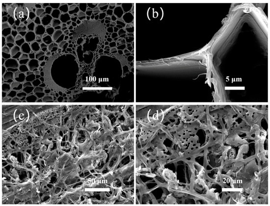 In comparison to other biomass materials, bamboo contains a higher concentration of nutrients, including starch and sugar, which renders it more susceptible to microbial degradation and leads to changes in its pore structure [15]. The native bamboo exhibits a well-ordered porosity, characterized by alternating brick-like (thick-walled) and fish-scale (thin-walled) microstructures in its cross-sectional SEM images (Figure 1a,b) [16]. Figure 1c,d shows bamboo pretreated with white-rot fungi for 2 weeks. After fungal treatment, the hyphae of white-rot fungi thrive on the inner walls of bamboo, creating an interconnected skeletal structure that augments the number of pathways for electron transport. Concurrently, the macropores were filled with hyphae growth, forming more small-sized pores than the original bamboo, thereby increasing the material’s specific surface area and enhancing its capacitive performance [17].