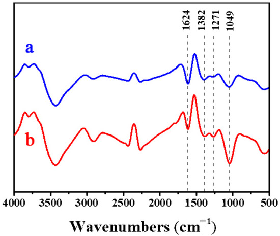 Figure 2 shows the FTIR spectra of bamboo before and after treatment with white-rot fungi, and Table 1 lists the detailed information about the FTIR spectra [18,19]. The results indicate that the intensity of the characteristic peaks of cellulose and hemicellulose at 1049 cm−1 weakened after fungal degradation, while the characteristic peaks of lignin at 1624 cm−1, 1382 cm−1, and 1271 cm−1 showed the most significant reduction. This implies that white-rot fungi possess the ability to degrade bamboo’s lignin, cellulose, and hemicellulose to varying extents, with a stronger propensity for lignin degradation [20]. Changes in the absorption peaks indicate a dynamic process characterized by the gradual decomposition of carbohydrates (cellulose and hemicellulose) and lignin into shorter-chain hydrocarbons and linear compounds during the degradation process. The cyclic structures in lignocellulose are gradually broken down into linear compounds. However, as the fungus grows and utilizes the small-molecule products obtained from the degradation of lignocellulose and enzymes further degrade the small molecules, the content of short-chain hydrocarbons and linear compounds gradually decreases.