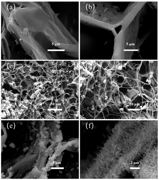 Top-view SEM images of (a,b) original bamboo-derived carbon (HBC-0), (c,d) hyphae/bamboo-derived carbon (HBC-2), and (e,f) MnO2/hyphae/bamboo-derived carbon (HBC-2M).
