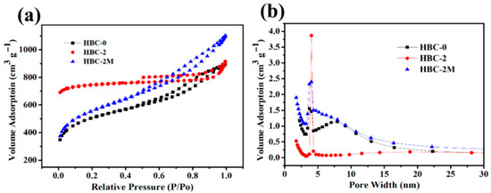 (a) Nitrogen adsorption–desorption isotherms and (b) pore size distributions of HBC-0, HBC-2, and HBC-2M.