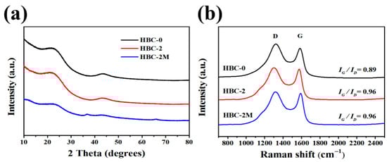 The crystal structures of HBC-0, HBC-2, and HBC-2M were analyzed by X-ray diffraction (XRD) (Figure 5a). All three samples displayed two diffraction peaks at approximately 22.4° and 43.7°, corresponding to the (002) and (101) planes of carbon, indicating the presence of graphite-like structures. The peaks were broad and diffuse, indicative of low crystallinity and an amorphous nature of the materials. Comparing the XRD patterns of HBC-2M with those of HBC-0 and HBC-2, it can be seen that the peak positions of HBC-2M were closer to the theoretical graphite (002) peak, indicating a higher degree of graphitization. Additionally, two characteristic peaks observed at 36.8° and 66.2° in the XRD pattern of HBC-2M confirmed the successful formation of MnO2 [25], which matches the standard card for δ-MnO2 (JCPDS 80-1098) and is consistent with birnessite-type MnO2. Based on Bragg’s Law, the interlayer spacings for HBC-0, HBC-2, and HBC-2M are 3.967 Å, 4.015 Å, and 3.844 Å, respectively. In contrast, the theoretical interlayer spacing of graphite is 3.35 Å (2θ = 26.4°). The peak position of HBC-2M is closer to that of graphite, indicating a high degree of graphitization.