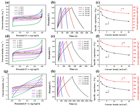 Electrochemical performance of HBC-0: (a) CV curves at various scan rates, (b) GCD curves at different current densities, and (c) rate performances. Electrochemical performances of HBC-2: (d) CV curves at various scan rates, (e) GCD curves at different current densities, and (f) rate performances. Electrochemical performance of HBC-2M: (g) CV curves at various scan rates, (h) GCD curves at different current densities, and (i) rate performances.