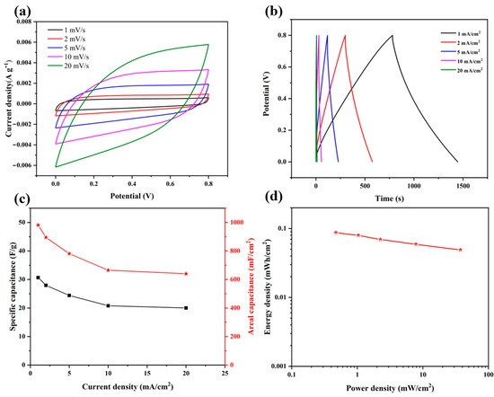To explore the electrochemical performance of HBC-2M at the device level and to investigate its significance at the practical energy storage level, two identical HBC-2M electrodes were taken as working electrodes, and a 1M Na2SOe solution was used as the electrolyte, with a cellulose membrane as the separator to assemble a symmetrical supercapacitor. Electrochemical measurements were conducted under a dual-electrode system. Figure 7 shows the electrochemical performance of symmetrical supercapacitors. The CV curves in Figure 7a show that at different scanning rates, all CV curves are quasi-rectangular without obvious deviation. The polarization of the hydrated sodium ion desolvation process in the three-electrode system and the low conductivity phenomenon caused by MnO2 in the mixed electrode are stabilized under the two-electrode system. According to the GCD curves in Figure 7b, it can be seen that at different current densities, all GCD curves show intentional symmetry, indicating that it has good capacitive performance and excellent reversibility. The area-specific capacitances of the supercapacitors assembled with HBC-2M at current densities of 1, 2, 5, 10, and 20 mA cm−2 are 981.5, 895.12, 781.25, 665.22, and 640.3 mF cm−2, respectively, while the mass-specific capacitances are 30.6, 27.97, 24.41, 20.73, and 18.09 F/G. Even at a current density of 20 mA cm−2, the area-to-capacitance ratio is still 65.23% of that at 1 mA cm−2, demonstrating excellent rate performance. Figure 7d shows the energy density and power density curves of supercapacitors. HBC-2M has an energy density of 0.087 mWh cm−2 at a power density of 0.47 mW cm−2 and still has an energy density of 0.048 mWh cm−2 even at a power density of 37.25 mW cm−2. This indicates that HBC-2M still has good electrochemical performance at the device level and practical application value at the device level.